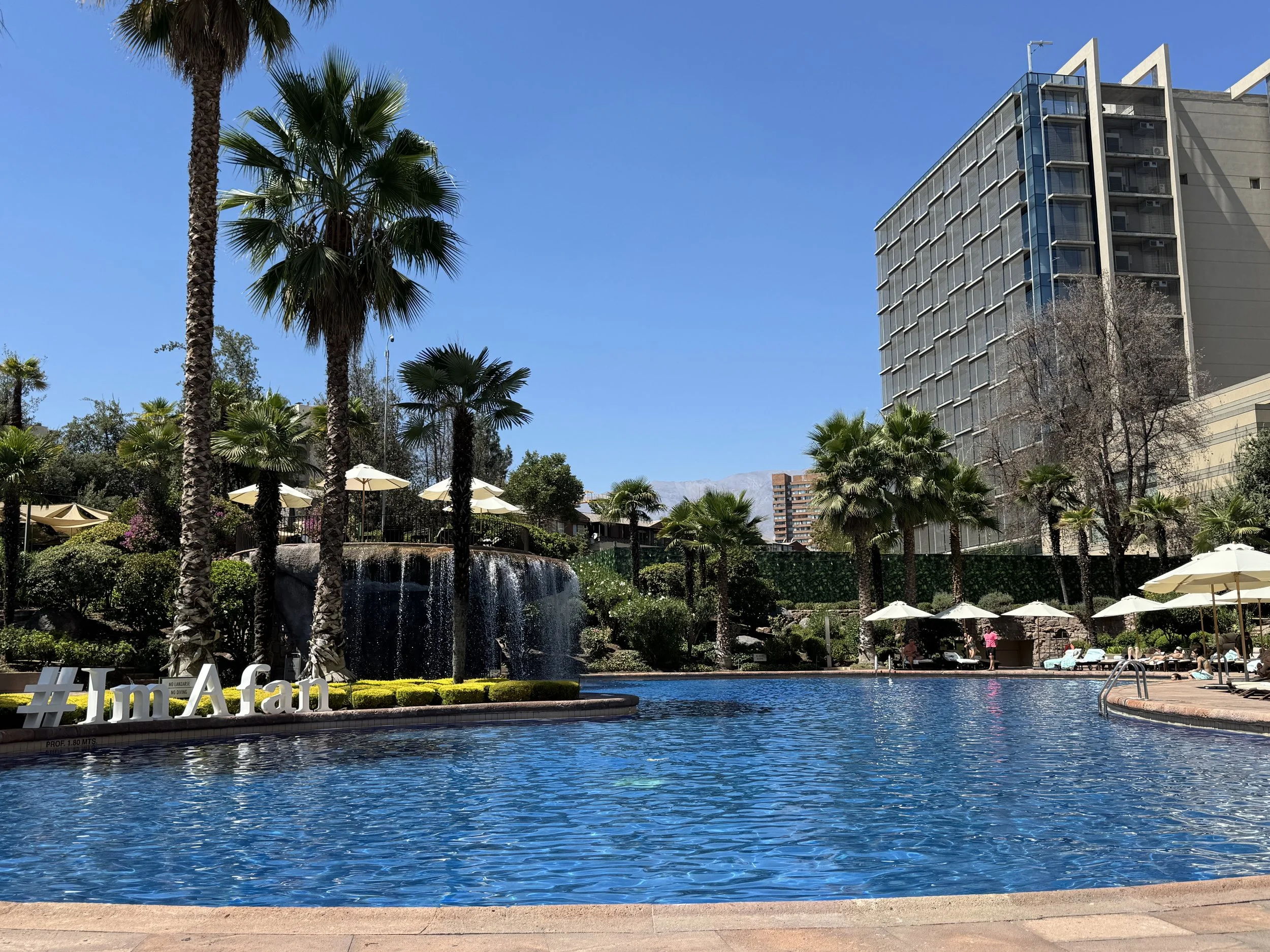 Oasis-style hotel pool with waterfall and luxurious poolside service for drinks and bites throughout the day — loved the Pisco Sours and Aperol Spritzes here