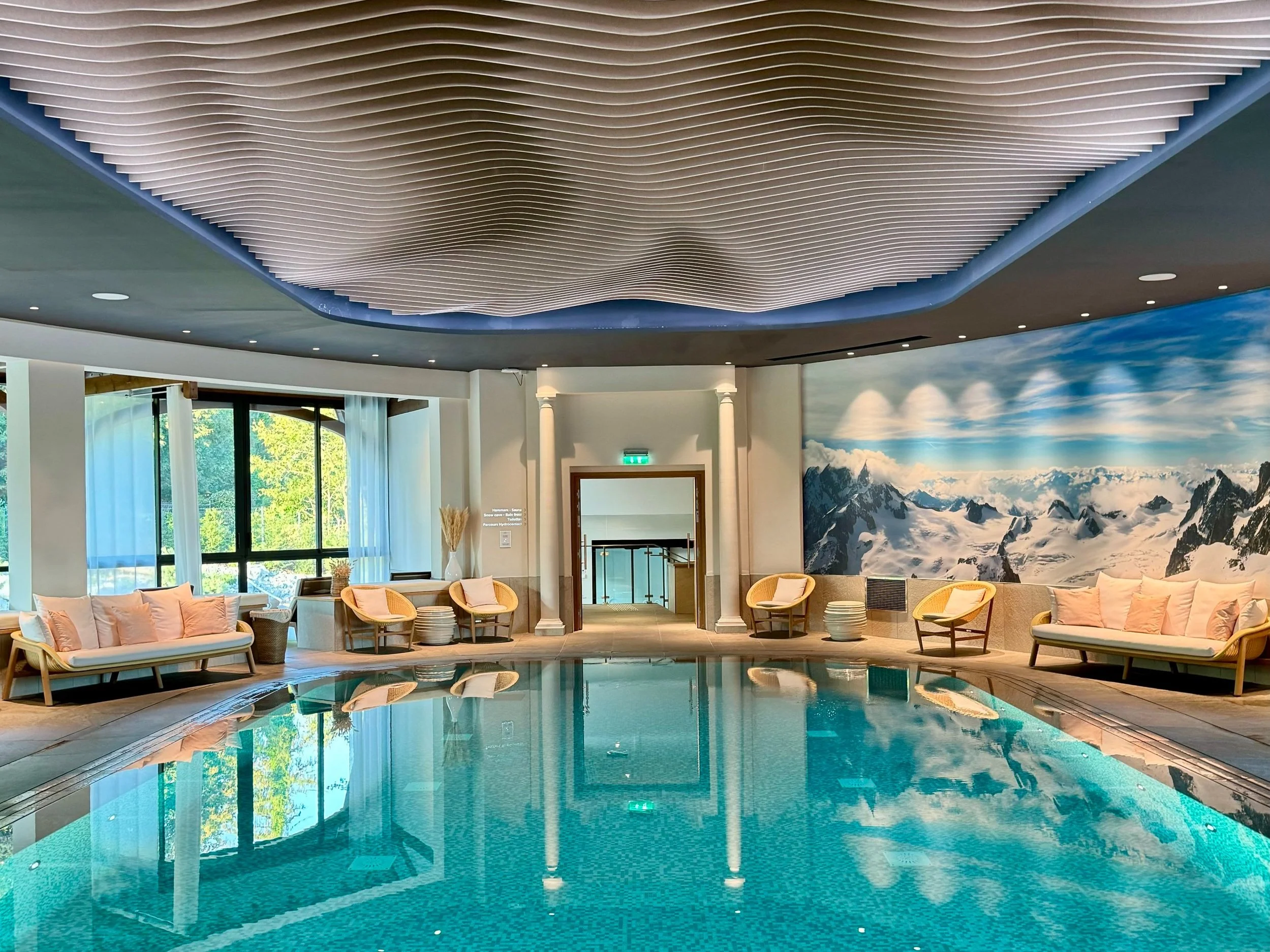 The onsite evian®SPA facilities and indoor pool/outdoor thermal spa complex — spa even offered treatments for families and children